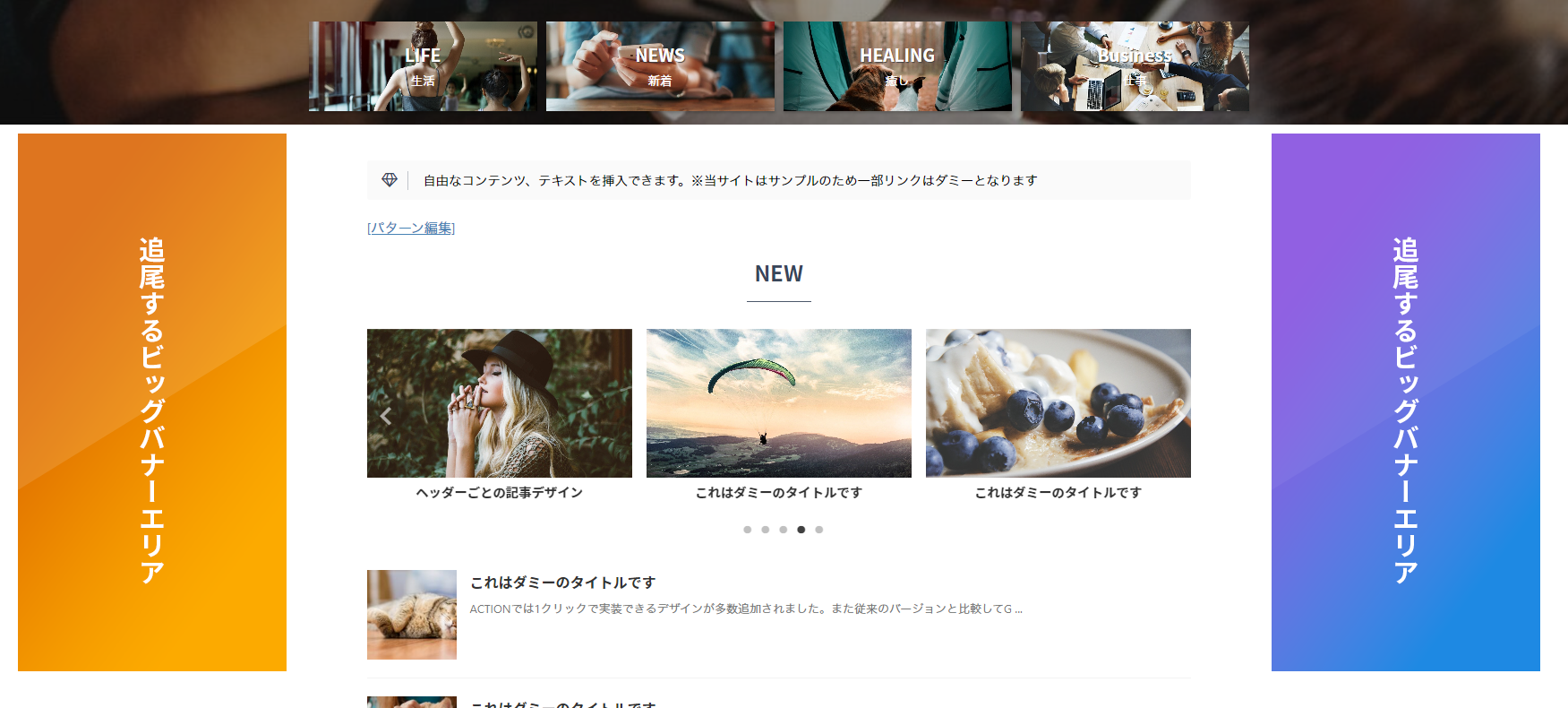 HOME > 追尾するビッグバナーエリア PC閲覧時(959px以上)に表示される左右の追尾式バナーエリアです。 Googleアドセンス広告など非常に目に付くインパクトの強い広告を設置することができます。 右だけ又は左だけなど片方だけに設置することも可能です記事ごとに非表示にできます ※バナーエリアは閲覧幅によっては見切れる仕様となります。※サイトのセンター(中心)はバナーエリアを除いた幅が基準となります。 ウィジェットでコンテンツを設置 当サンプルサイトはAFFINGER6で作成されています。詳しくはコチラをご確認下さい。 ※サンプルサイトのご注意事項 2022年9月14日 author