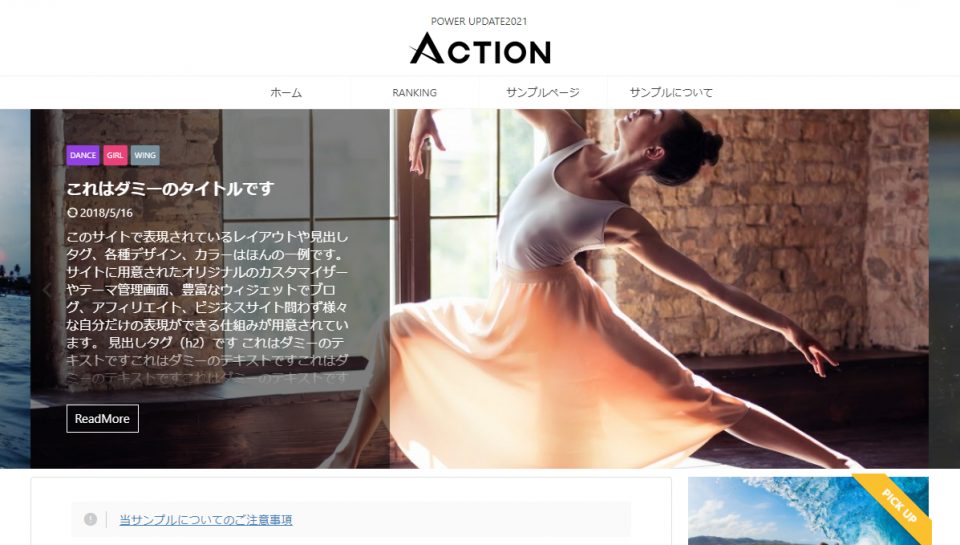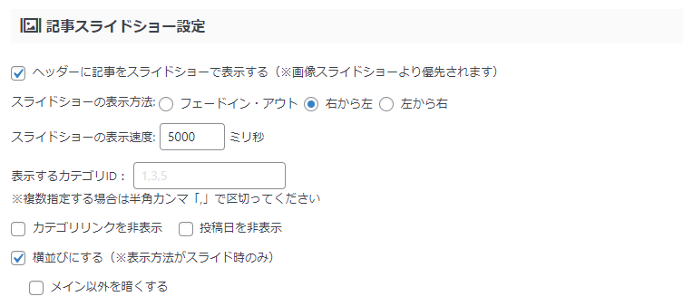 ヘッダーの記事スライドショーはテーマ管理の「ヘッダー」>”記事スライドショー設定”で設定しています。