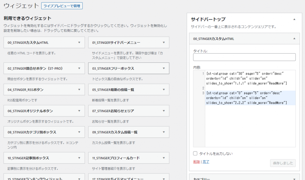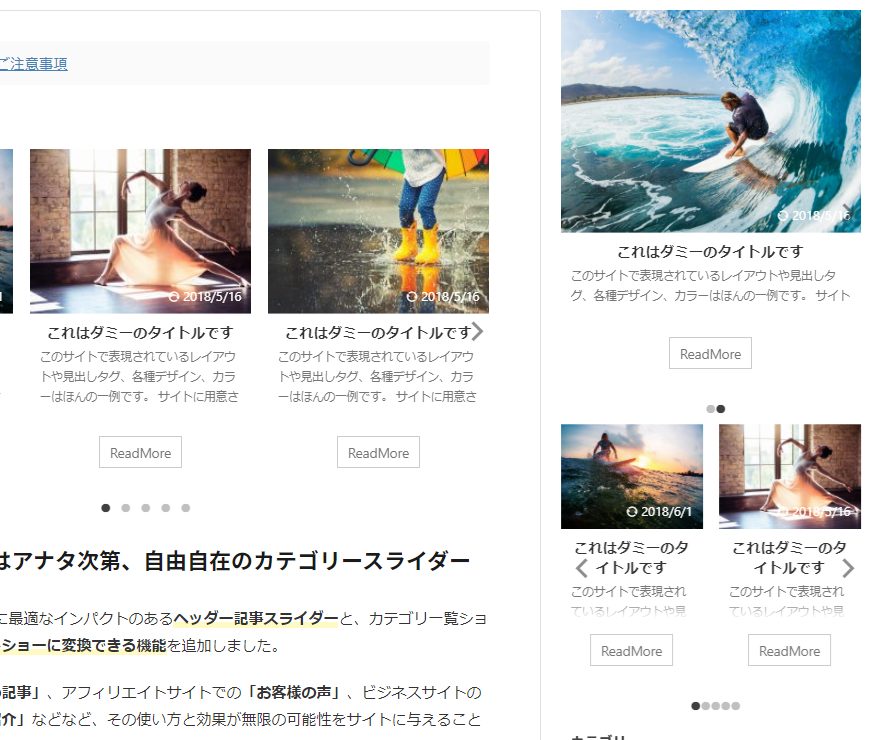 サイドバーのスライドショーはウィジェットエリアにカテゴリ一覧スライドショーをショートコードで設定しています。