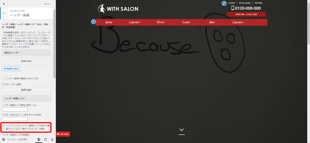 トップページのheaderエリアを全画面に表示したい場合はカスタマイザーの「ヘッダー画像」>”トップページのヘッダー画像エリアの高さを画面サイズに応じて最大にする”を有効化します。