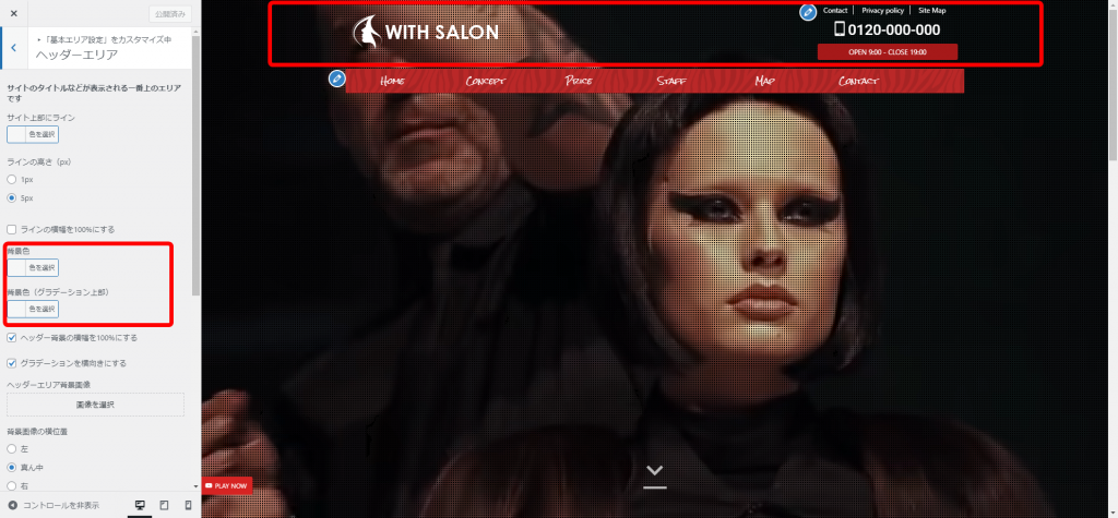 ヘッダーエリアに背景色があり透過させたい場合は「基本エリア設定」>「ヘッダーエリア」の背景色の値を空にします。