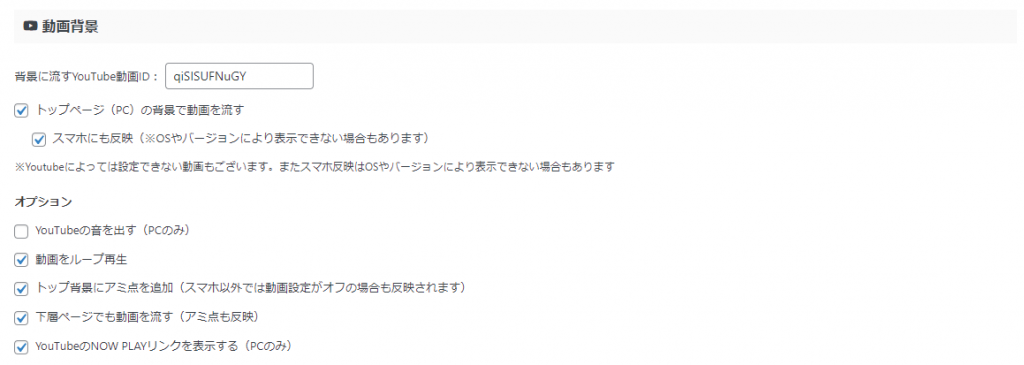 YouTube動画を背景にする場合はテーマ管理の「トップページ」>”動画背景”でYouTube動画のIDを設定します。