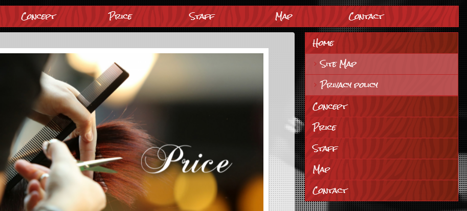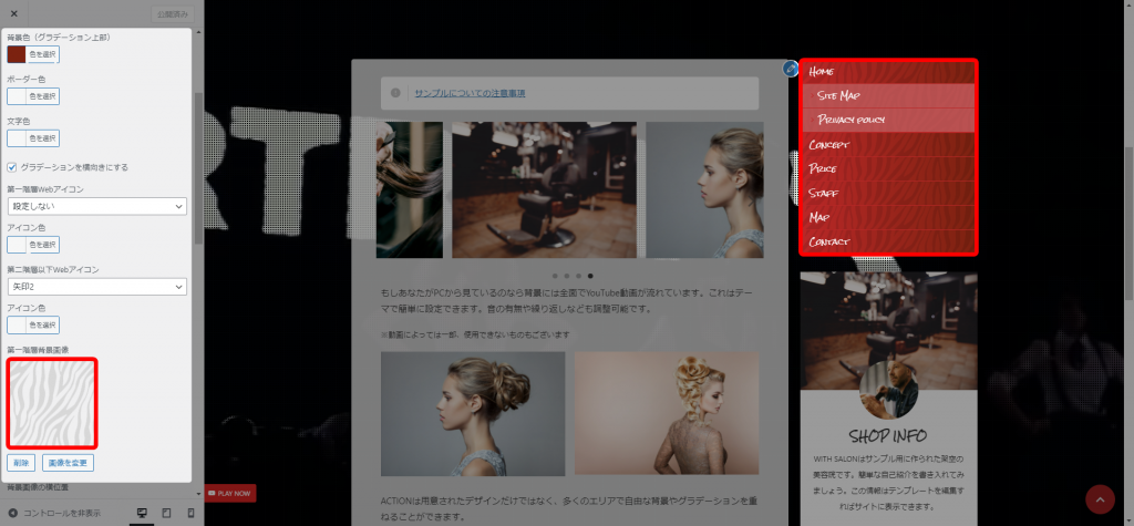 サイドメニュー のゼブラ柄の背景画像はカスタマイザーの「各メニュー設定」>「サイドメニューウィジェット」の背景画像設定にて透過したゼブラ柄のpng素材を背景色に重ねています。